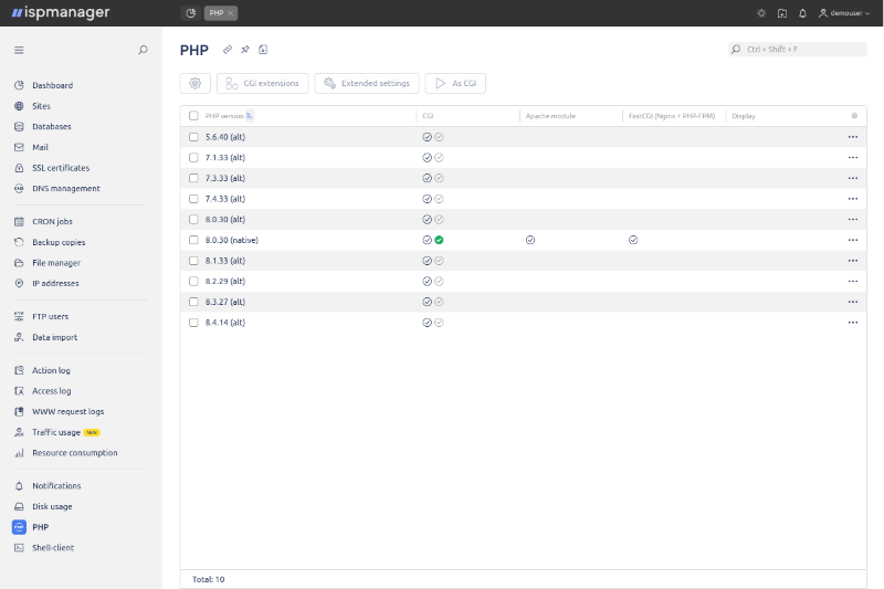 Katrai vietnei dažādas PHP (5.x līdz 8.x), Python un Node.js versijas vienlaicīgi.